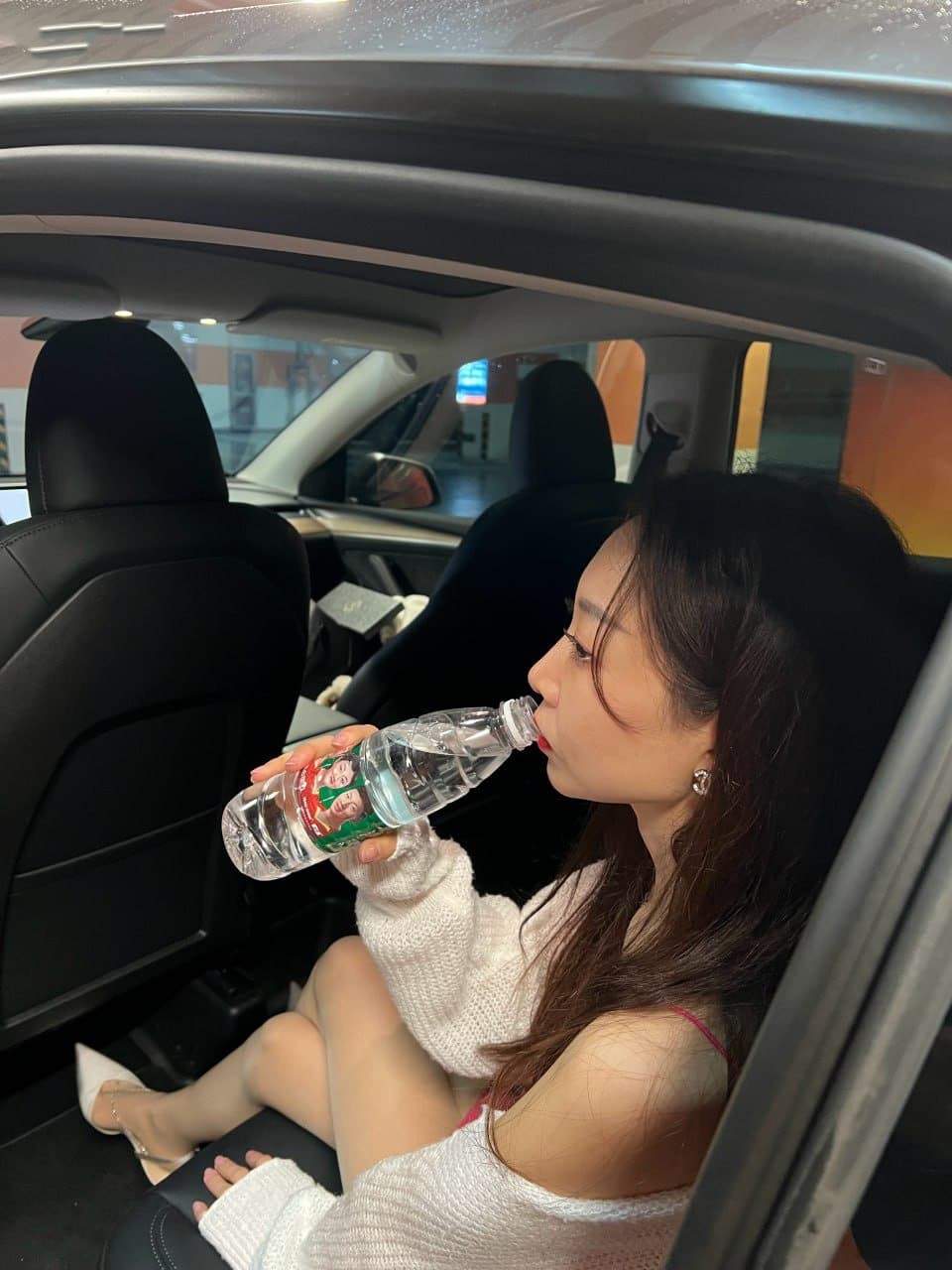 从副驾驶视角向后拍摄,高跟鞋在座椅边缘,展现出都市夜归人的一丝疲惫与距离感。